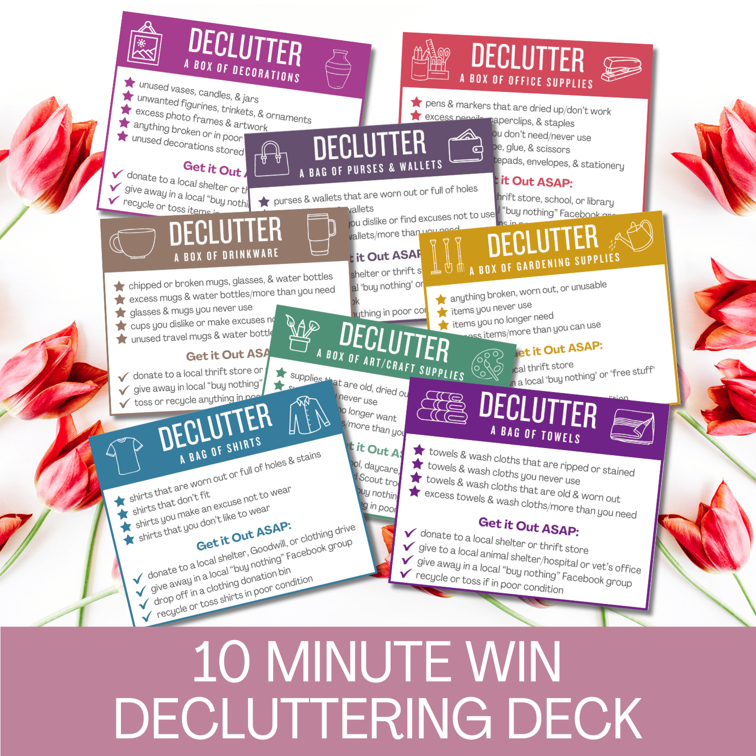- A digital PDF download featuring 60 unique decluttering cards to help you make major decluttering progress just 10 minutes at a time.