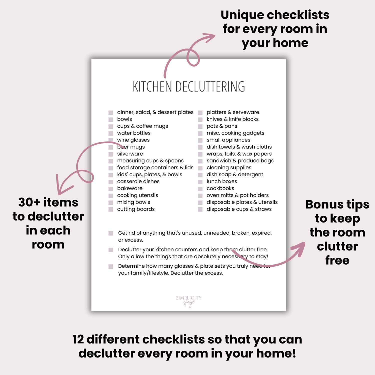 - Every checklist includes 30+ items to declutter in each room, plus bonus tips to keep the room clutter free.